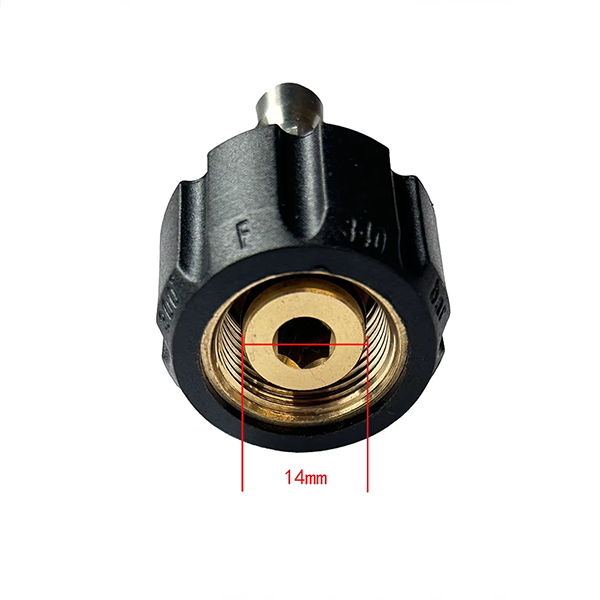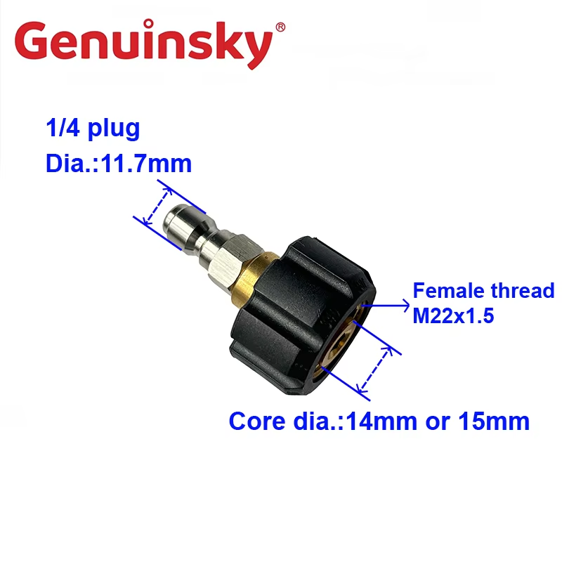 この製品は、1/4インチのクイックプラグです。クイックプラグの直径は11.7mで、もう一方の端はM22×1.5の女性スレッドです。 Core Dia.14mmまたは15mmの2つの穴の直径があります。現代社会の多くの高圧クリーニングシナリオで広く使用されています。