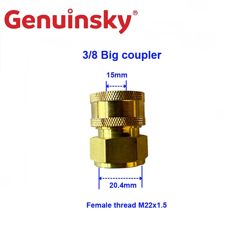 Thrueinsky 3/8 Big Coupler、体はすべての銅で作られており、真鍮の材料は腐食抵抗に大きな利点があります。製品の一方の端は、メスの糸M22×1.5で、内径は20.4mmで、シーリングワッシャーが装備されており、鋼線編組チューブと対応する仕様の高圧ホースで使用できます。