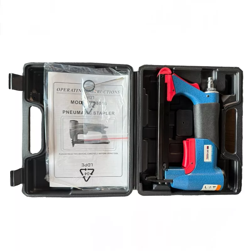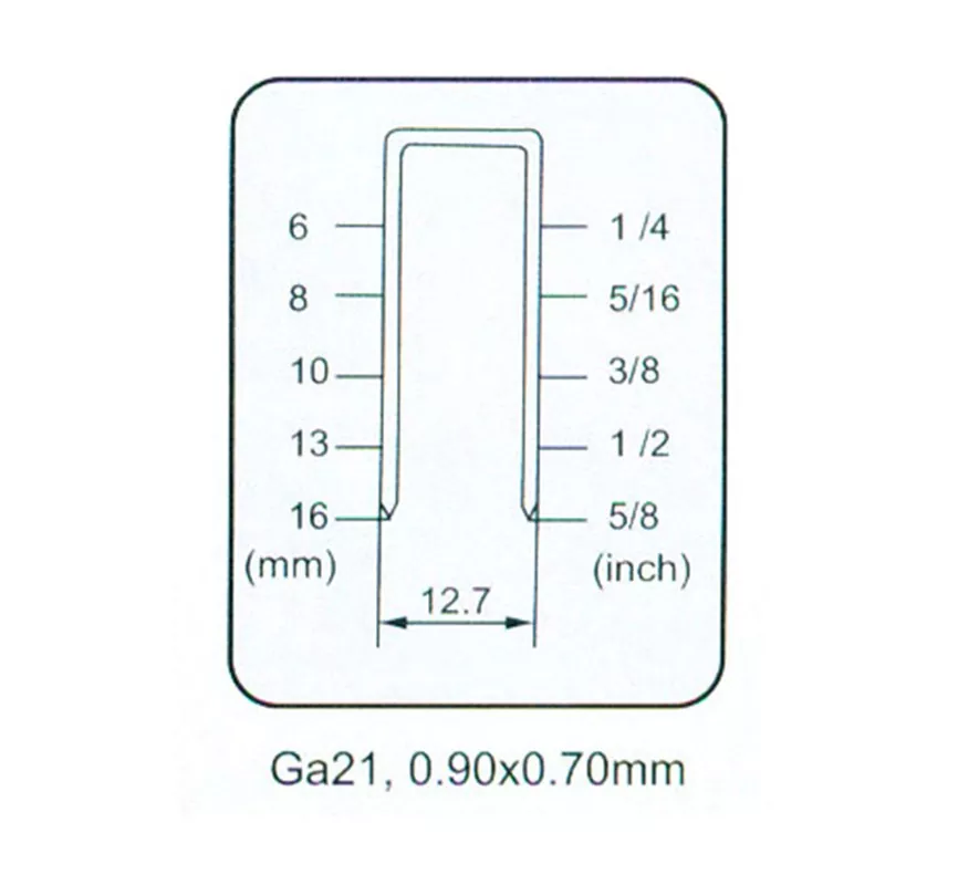 製品モデルには、主に8016Bエアファインクラウンステープラー、8016Cエアファインクラウンステープラー、8016LN(長い鼻)エアファインクラウンステープラーが含まれています。適切な爪Ga21、0.90x0.70mm、肩の距離12.7mm、爪の高さは6mm、8mm、10mm、13mm、16mm(1/4、5/16、3/8、1/2、5/8インチ)になります。