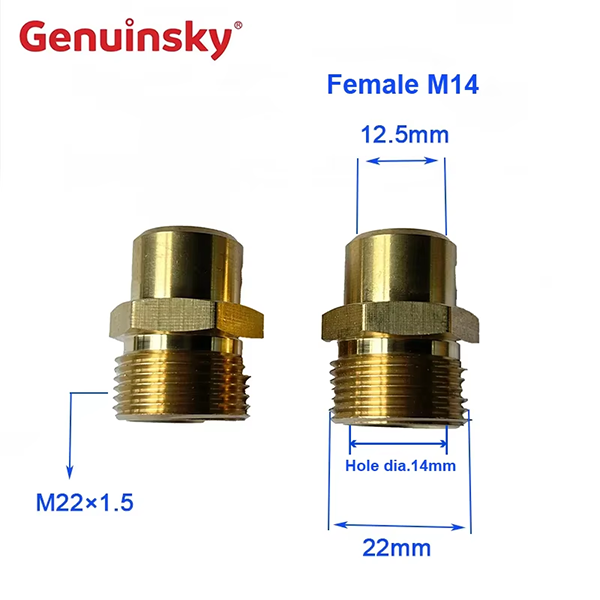 高圧炭水化物洗浄装置に適した真鍮パイプフィッティング。まず、製品自体のサイズから始めましょう。一方の端は男性の糸M22×1.5で、直径は22mmと穴のDia.14mmです。もう一方の端には、直径が12.5mmのメスのスレッドM14があります。ニーズに応じて、適切な高圧クリーニングマシンで使用できます。