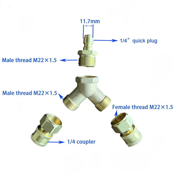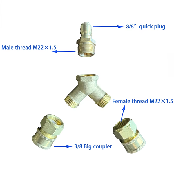 2つのモデルがあり、最初のモデルは1/4 "プラグと2pcs 1/4"カプラーを備えた3ウェイコネクタです。 1/4 "プラグの一方の端には、直径11.7mmのクイックプラグ設計があり、もう一方の端は男性のスレッドM22×1.5です。2つの1/4"カプラーの片端はメスのスレッドM22×1.5で、もう一方の端は1/4カプラーです。 2つ目は、3/8 "プラグと2PCS 3/8"カプラーを備えた3ウェイコネクタです。3/8 "プラグ。一方の端もクイックプラグデザインであり、もう一方の端は男性です。2つの3/8"カプラーの一方の端はメスのスレッドM22×1.5であり、もう一方の端は3/8ビッグコーラーです。材料は完全な銅であり、良好な腐食抵抗があり、炭水化物の複雑な環境で安定した接続を維持できます。同時に、銅には特定の強度と優れた延性もあります。これは、高圧洗浄環境に信頼できる選択肢です。 1/4インチのサイズは、炭水化物、スプレーガン、その他の機器に柔軟に適合させることができます。 3/8インチの仕様は、大型車両の清掃や産業機器の清掃など、より大きな流れの使用に適用できます。これにより、洗浄の効率が大幅に向上します。