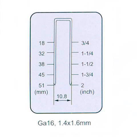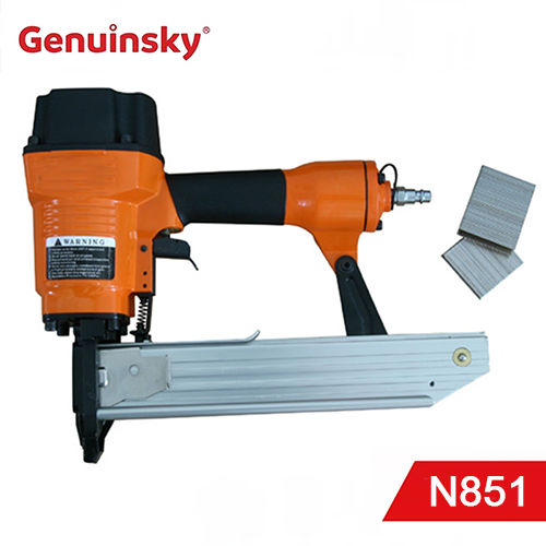 N851エアクラウンステープラーは、大きなネイルGA16、1.6mmx1.4mm、肩の距離10.8mm、爪の高さは18mm、32mm、38mm、45mm、51mm(3/4、1-1/4、1-1/2、1-3/4、2インチ)を備えた頑丈なエアネイルガンです。