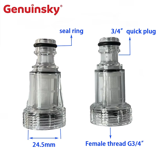 まず、製品自体を紹介しましょう。製品の一方の端は、シールリング付きの3/4 "クイックプラグです。このインレットウォーターフィルターには多くの利点があります。最初に透明な材料で作られています。透明な材料は内部視覚化を意味するため、使用中にいつでも使用を確認できます。第三に、製品の一方の端は3/4 "クイックプラグ構造です。クイックプラグ構造をすばやくインストールして分解できるため、オペレーターの時間を大幅に節約できます。同時に、インストールは非常にシンプルであり、非専門家も簡単にインストールできます。第四に、透明な材料自体も腐食耐性であり、一定の強度があり、高圧洗浄環境で使用できます。第五に、それは非常に適応性があり、Yili Lutian Batman Falcon Poseidonシリーズの車の洗濯機と同様に、さまざまな炭水化物装備に適応でき、調達のコストを削減できます。
