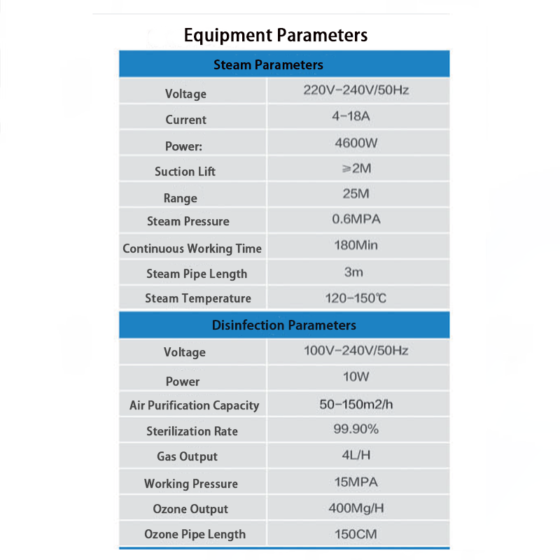 これ機械さまざまなパイプライン、便利な保管、ホームクリーニングと消毒、自動車の清掃、ケータリング、ホテル、その他の関連シナリオに適したプロのポータブル保護ボックスが装備されています。マシンは、蒸気、消毒、冷水と温水、パルスなどの機能があり、強力な性能と柔軟な使用を備えた機能を備えているため、複数の目的に使用できます。まず第一に、いくつかの機能データを紹介しましょう。まず、蒸気機能、電圧は220V -240V/50Hzに適合し、電力は4600W、吸引範囲は2m以上、アクション範囲は25m、蒸気温度は120〜150℃、蒸気圧は0.6MPaです。高温蒸気の助けを借りて。第二に、消毒機能、電圧は100V -240V/50Hzに適合し、電力は10W、空気精製能力は50〜150m²/h、滅菌速度は99.90%、ガス出力は4L/h、作業圧力は15mpa、オゾン出力は400mg/h、150mg/h、150mg/h、150mg/h、消毒領域、および120-150の蒸気温度は、滅菌活動を効果的に実行でき、あらゆる種類の細菌またはダニを殺すことができます。
