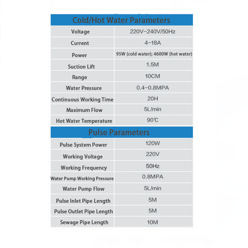 第三に、冷水および温水スイッチング機能、電圧は220V -240V/50Hzに適合し、冷水電力は95W、温水電力は4600W、吸引範囲は1.5m、範囲は10cm、水圧は0.4-0.8mpaです。気温、温水モード、または冷水モードは、さまざまな使用シナリオに従って切り替えることができます。第四に、パルス関数。パルスシステムの電力は120W、作業電圧は220V、周波数は50Hz、ポンプの作業圧力は0.8MPa、流量は5l/min、パルス入口パイプと出口パイプは5メートル、下水パイプは最大10メートルです。