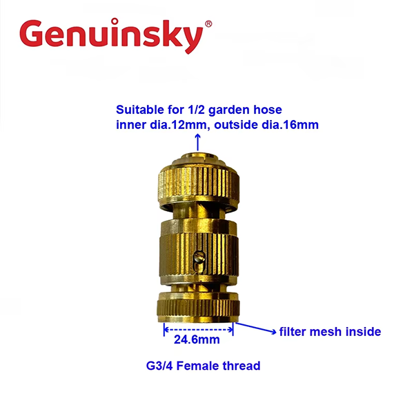 圧力洗浄機の吸気コネクタは、日常生活で多く使用される高圧洗濯機の水インレット端の接続部分です。 1/2の庭のホース、内部dia.12mm、dia.1 6mmに適しています。もう一方の端は、直径24.6mmのG3/4のメススレッドで、内部にフィルターメッシュがあります。