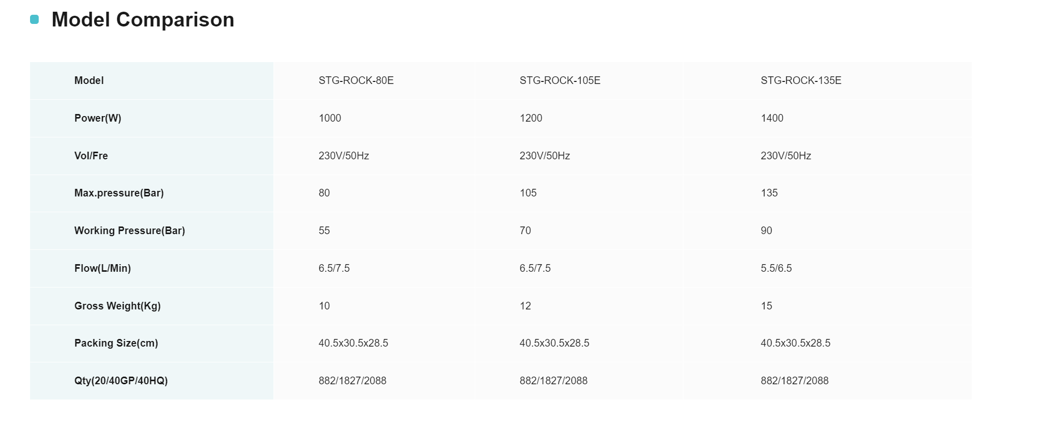 STG-ROCK-E ポータブル高圧洗浄機は、STG-ROCK-80E、STG-ROCK-105E、STG-ROCK-135E の 3 つのモデルに分かれています。電源仕様は3モデルとも230V/50Hzで、パッケージサイズも一律40.5×30.5×28.5cmとなっている。ハイキャビネットのボックス数も同じです。高さ 20 フィート キャビネットのボックス数は 882 ユニット、40GP ハイ キャビネットのボックス数は 1827 ユニット、40HQ ハイ キャビネットのボックス数は 2,088 ユニットです。